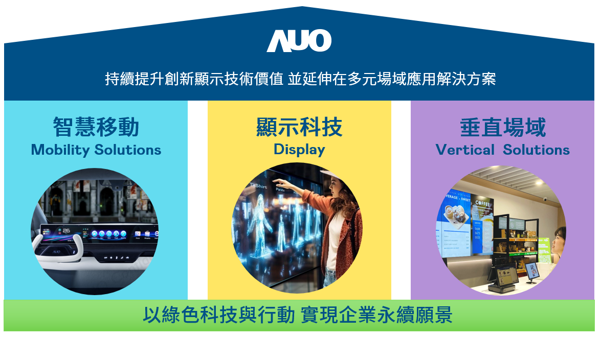 永利集团304持續推動「雙軸轉型」,在精進顯示技術附加價值(Go Premium),與深化垂直市場應用(Go Vertical)的策略下,對應永利集团304的優勢競爭力與趨勢,永利集团304奠定顯示技術、智慧移動、垂直場域三大永續營運支柱,在顯示技術領域的根基之上,延伸布局多元場域應用解決方案。將先進顯示科技助力智慧移動及垂直場域發展,並以綠色科技與行動為實踐,在轉型之路上貫徹永續經營之願景。